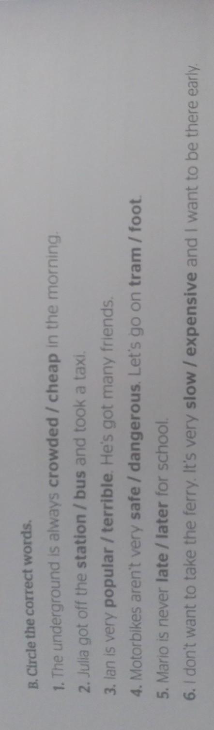 B. Circle the correct words. 1. The underground is always crowded / cheap in the morning. 2. Julia got off the station / bus and took a taxi. 3. lan is very popular / terrible. He's got many friends. 4. Motorbikes aren't very safe / dangerous. Let's go on tram/ foot. 5. Mario is never late/ later for school. 6. I don't want to take the ferry. It's very slow / expensive and I want to be there early.