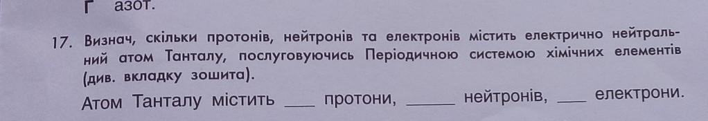 17. Визнач, скільки протонів, нейтронів та електронів містить електрично нейтраль- ний атом Танталу, послуговуючись Періодичною системою хімічних елементів (див. вкладку зошита). Атом Танталу містить нейтронів, електрони. протони,