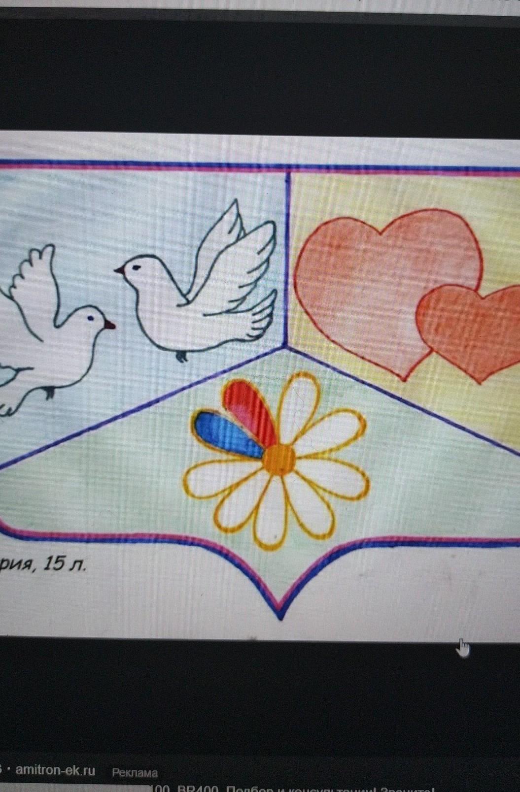я нарисовала сердце потому что в нашей семье царствует любовь, птиц потому что птици - знак добра и лёгкости а цветок я вижу как знак -нежности , ух надеюсь правильно ☺️