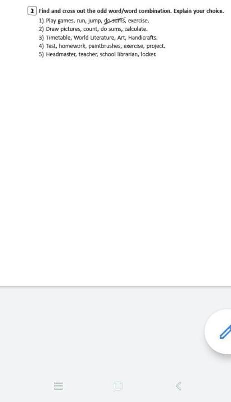 2 Find and cross out the odd word/word combination. Explain your choice. 1) Play games, run, jump, do sams, exercise. 2) Draw pictures, count, do sums, calculate. 3) Timetable, World Literature, Art, Handicrafts. 4) Test, homework, paintbrushes, exercise, project. 5) Headmaster, teacher, school librarian, locker. Помогите пожалуйста!