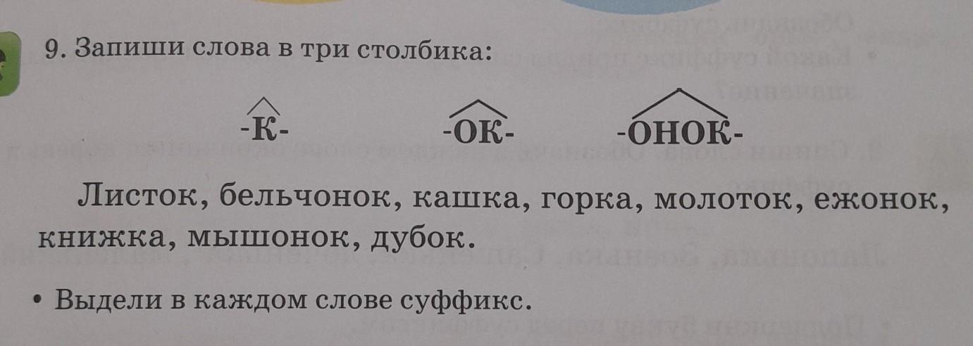 9. Запиши слова в три столбика: -К- -ОНОК- -ОК- Листок, бельчонок, кашка, горка, молоток, ежонок, книжка, мышонок, дубок.ПОМОГИТЕ ПОЖАЛУЙСТА ВЫПОЛНИТЬ