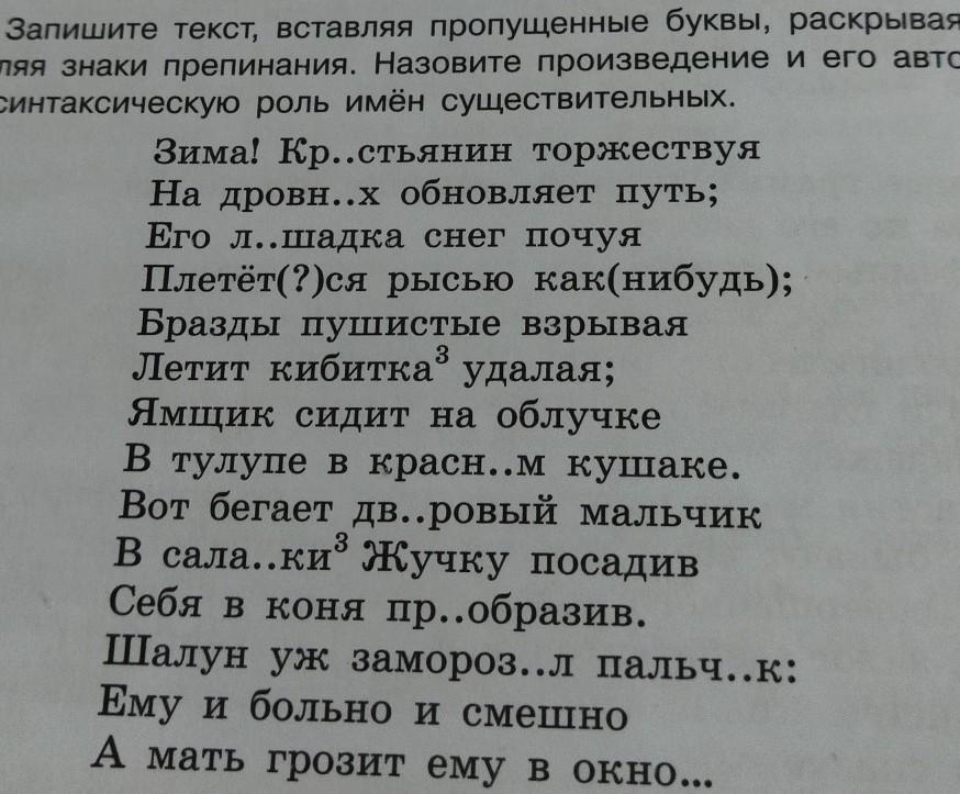 139 Запишите текст, вставляя пропущенные буквы, раскрывая скобки расставляя знаки препинания. Назовите произведение и его автора. One делите синтаксическую роль имен существительных. Зима! Кр..стьянин торжествуя На дрови..х обновляет путь, Его л..шадка снег почуя Плетёт(?)ся рысью как(нибудь); Бразды пушистые взрывая Летит кибитка³ удалая; Ямщик сидит на облучке В тулупе в красн..м кушаке. Вот бегает дв..ровый мальчик В сала..ки³ Жучку посадив Себя в коня пр..образив. Шалун уж замороз..л пальч..к: Ему и больно и смешно А мать грозит ему в окно...
