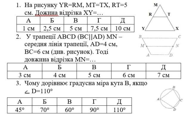 1. RT - середня дінія трикутника. RT= 1/2(половина) XY. Звідси XY=2RT= 2*5=10