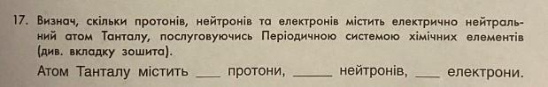 17. Визнач, скільки протонів, нейтронів та електронiв мiстить електрично нейтраль- ний атом Танталу, послуговуючись Періодичною системою хімічних елементів (див. вкладку зошита). Атом Танталу містить нейтронів, протони, електрони.