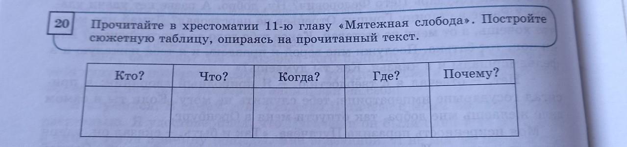 Прочитайте в хрестоматии 11-ю главу "Мятежная слобода". Постройте сюжетную таблицу, опираясь на прочитанный текст.