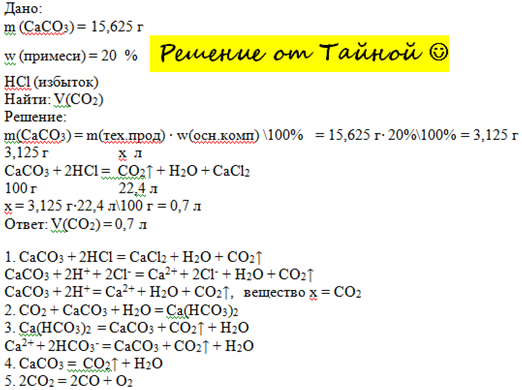 1)На 15,625г мрамора содержащего 20%некорбонатных примесей, подействовали избытком саляной кислоты,вычислить обьём выделевшегося газа.