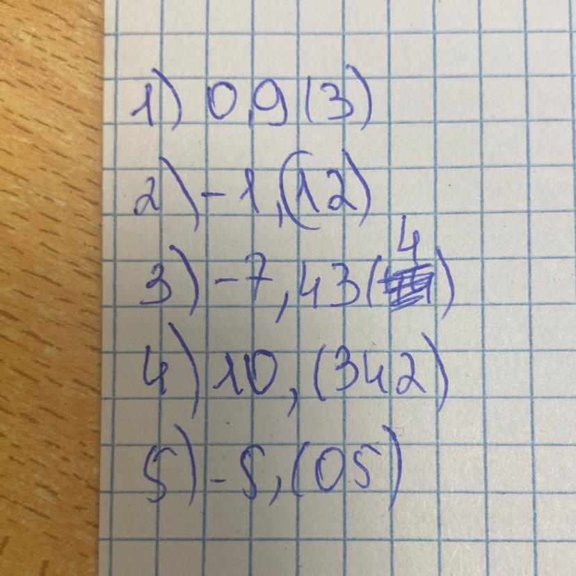 1.Запишите период периодической дроби в скобках: 1)0,93333 2)-1,121212 3)-7,43444 4)10,342342 5)-5,050505