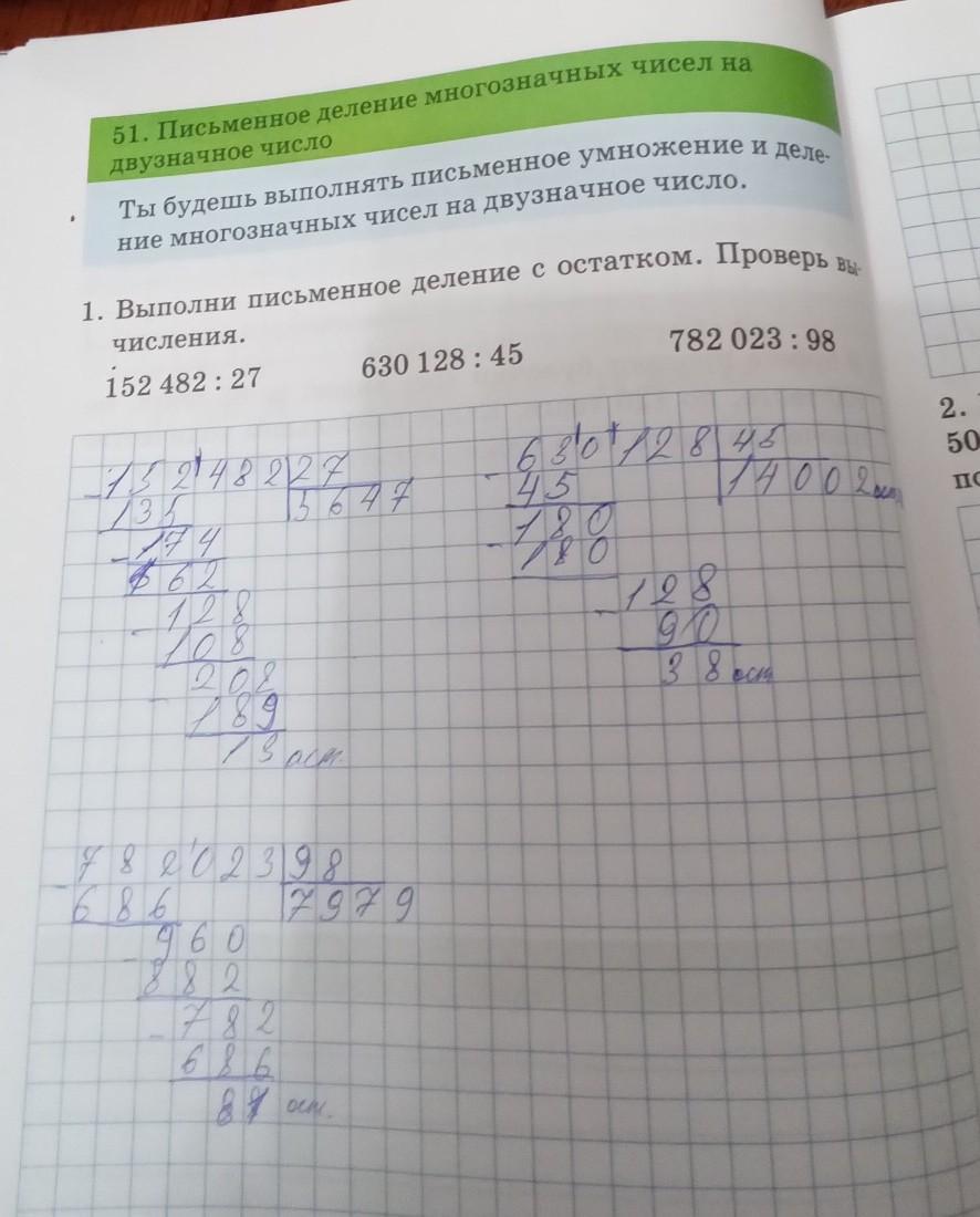 51. Письменное деление многозначных чисел на двузначное число Ты будешь выполнять письменное умножение и деле- ние многозначных чисел на двузначное число. 1. Выполни письменное деление с остатком. Проверь вы числения. 152 482:27 630128:45 782 023: 98 НУЖНА ПРОВЕРКА!!!