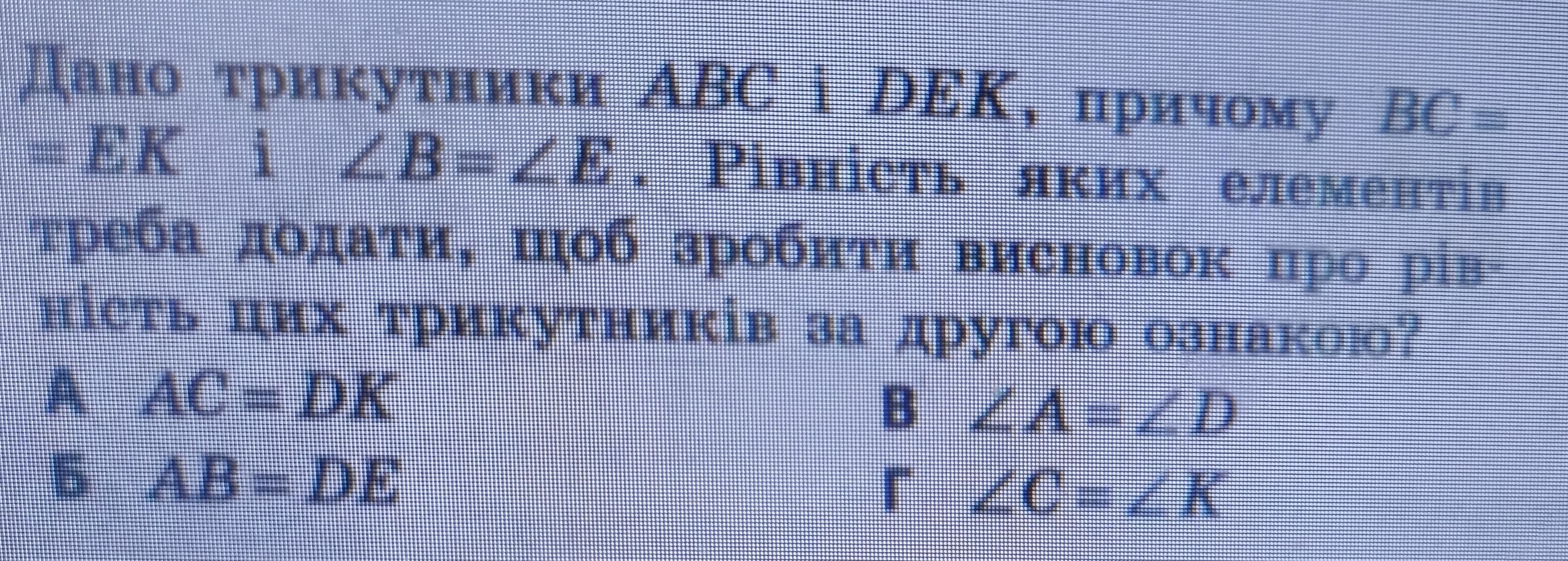 Дано трикутники ABC i DEК, причому BC = = EK i angle B = angle E . Рiвнiсть яких елементів треба додати, щоб зробити висновок про рів- ність цих трикутників за другою ознакою?