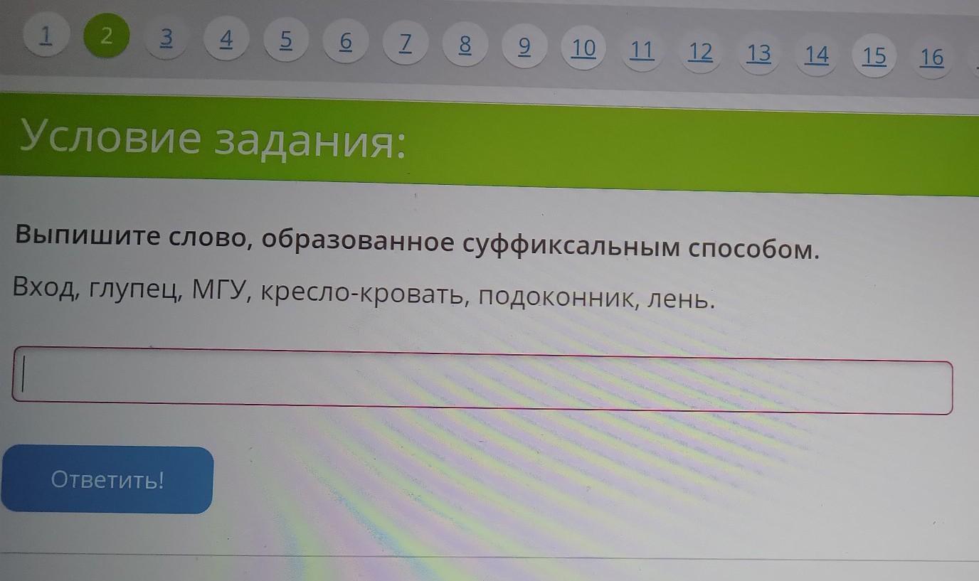 Выпишите слово, образованное суффиксальным способом. Вход, глупец, МГУ, кресло-кровать, подоконник, лень.