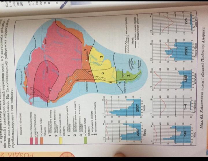 5. В області екватора розташований екваторіальний кліматичний пояс, біля північного і південного тропіків розташовані два тропічні пояси, у помірних широтах — два помірні, біля полюсів — полярні: арктичний і антарктичний