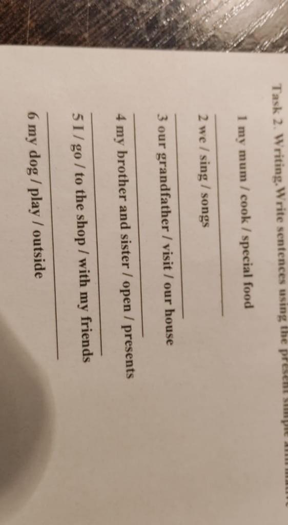 Task 2. Writing. Write sentences using the present simple affirmative 1 my mum/ cook / special food