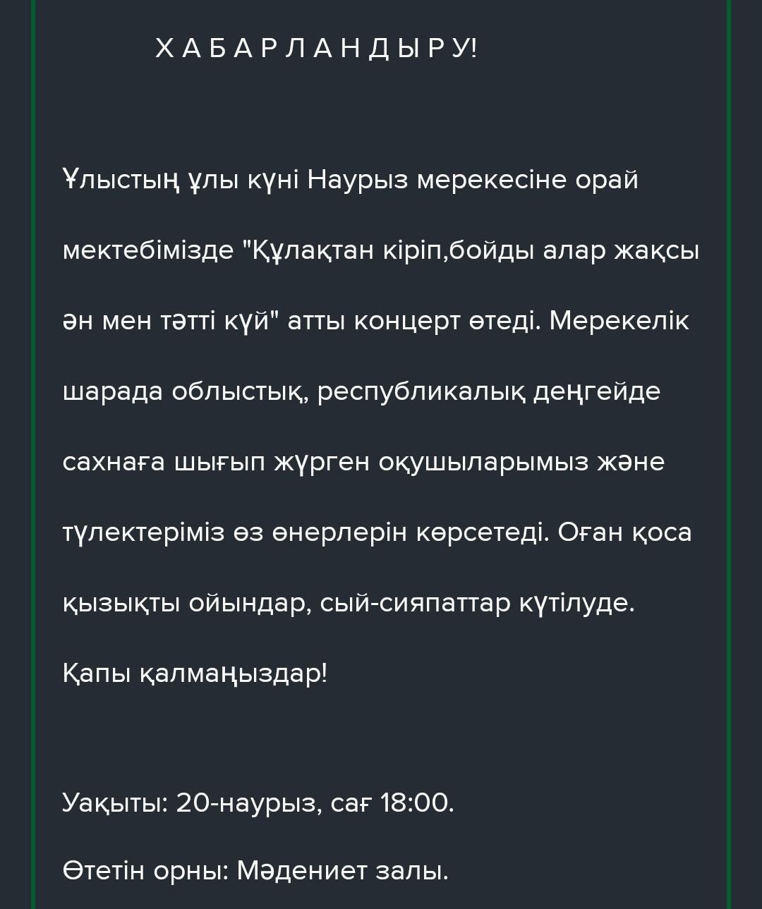 «құлақтан кіріп бойды,алар жақсы ән мен тәтті күй» атты тақырыпта концерт өтетіндегі туралы хабарландыру