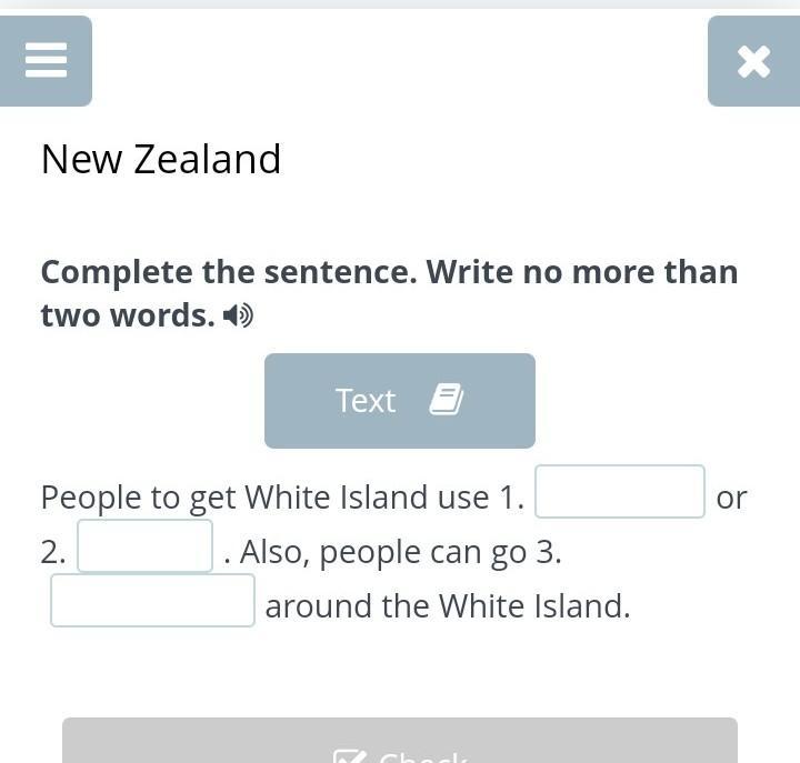 New Zealand Complete the sentence. Write no more than two words. 1) Text People to get White Island use 1. 2. . Also, people can go 3. around the White Island. or