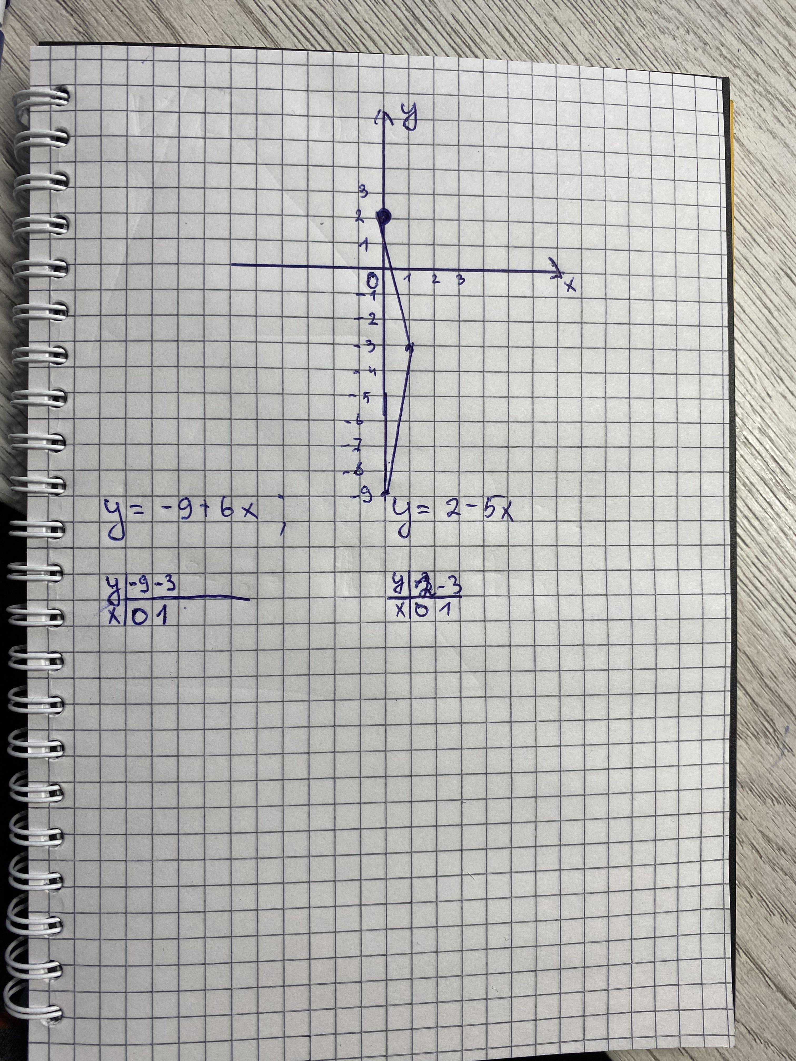 3. Постройте графики линейных функций у = -9+6хи у = 2 - 5х и найдите координаты точки пересечения.
