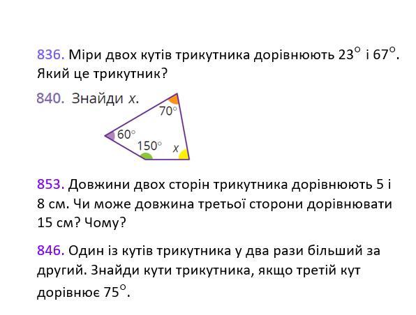836. Сума кутів трикутника 180°. ∠1=23°, ∠2=67°, тоді
