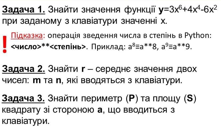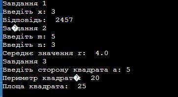 У першій задачі просто обчислюємо по формулі. Кожне завдання у окремих функціях. У другій задачі m+n/2(кількість чисел) і ось середнє. У третій задачі дано квадрат, отже усі сторони рівні, тому площа рахується a*a. Якщо вам потрібно пояснити абсолютно все то можете написати мені у телеграм (@xanr1a)