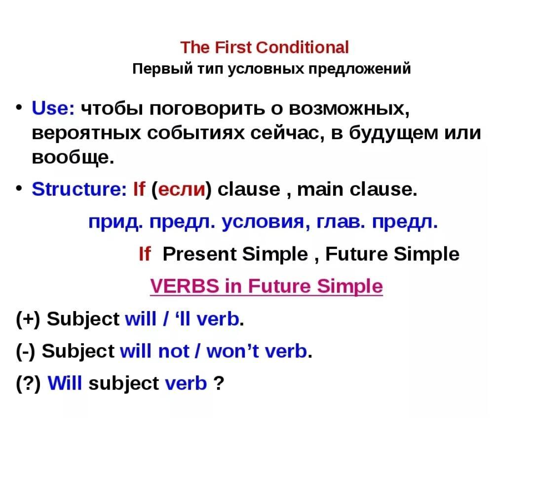 Первый тип условных предложений в английском языке (first conditional) используется для того, чтобы сказать о реальных будущих последствиях соблюдения или несоблюдения определенного условия.