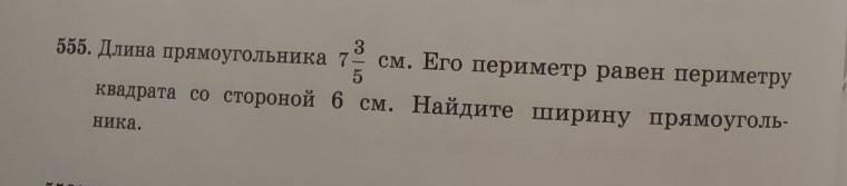 555. Длина прямоугольника 7 см. Его периметр равен периметру квадрата со стороной 6 см. Найдите ширину прямоуголь- ника. (((((((((((((ЖЕЛАТЕЛЬНО ФОТО)))))))))))))))