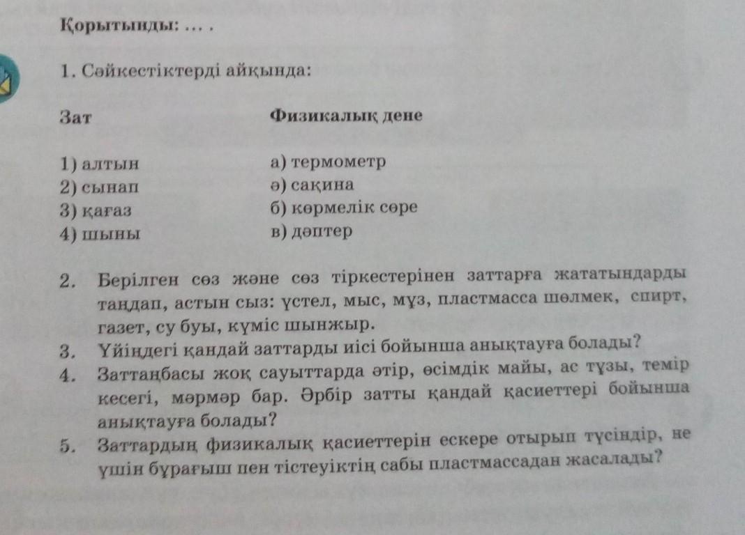1. Сәйкестіктерді айқында: Зат 1) алтын 2) сынап 3) кагаз 4) шыны 2. Физикалық дене 3. 4. a) термометр ә) сақина б) көрмелiк сере в) дәптер Берілген сөз және сөз тіркестерінен заттарға жататындарды тандап, астын сыз: үстел, мыс, мұз, пластмасса шөлмек, спирт, газет, су буы, куміс шынжыр. Үйiндегi кандай заттарды иiсi бойынша анықтауға болады? Заттанбасы жок сауыттарда әтір, өсімдік майы, ас тұзы, темір кесегі, мәрмәр бар. Әрбір затты кандай қасиеттері бойынша анықтауға болады? 5. Заттардың физикалық қасиеттерін ескере отырып түсіндір, не үшін бұрағыш пен тістеуіктішң сабы пластмассадан жасалады?