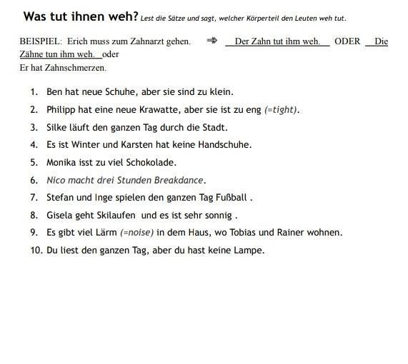 6. Er hat Rückenschmerzen./ Der Rücken und die Beine tun ihm weh.