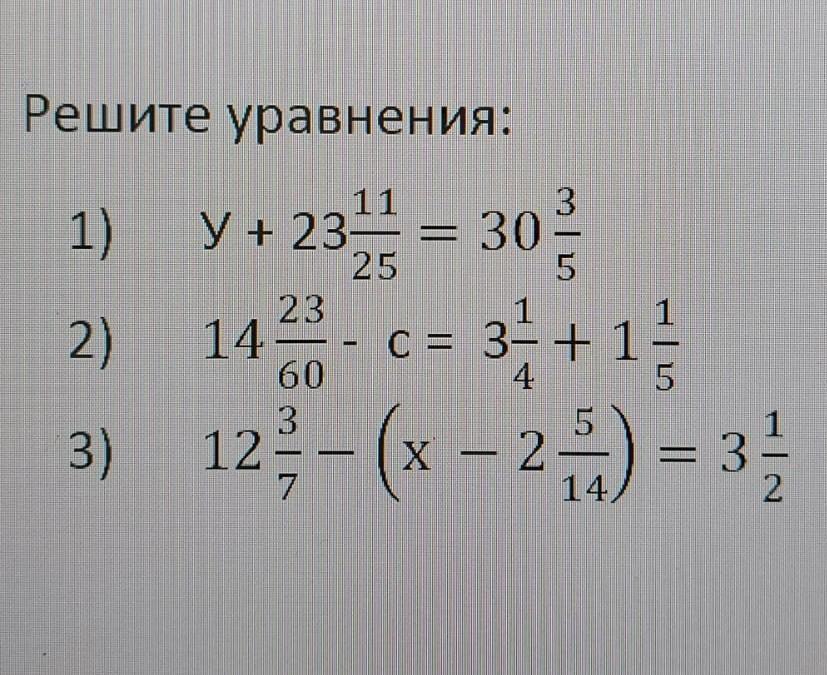 Решите уравнения: 1) y + 23/11/25 = 30²/ У 25 5 23 2) 14- 60 3 3) 12 - - -(x − 2) = 3 - c = 3- + 1 1