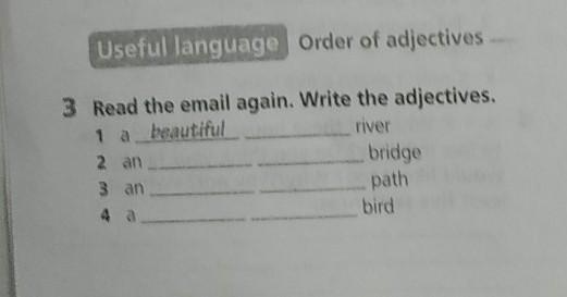 3 Read the email again. Write the adjectives. 1 a beautiful river 2 an 3 an 4 a bridge path bird пж помогите умоляю