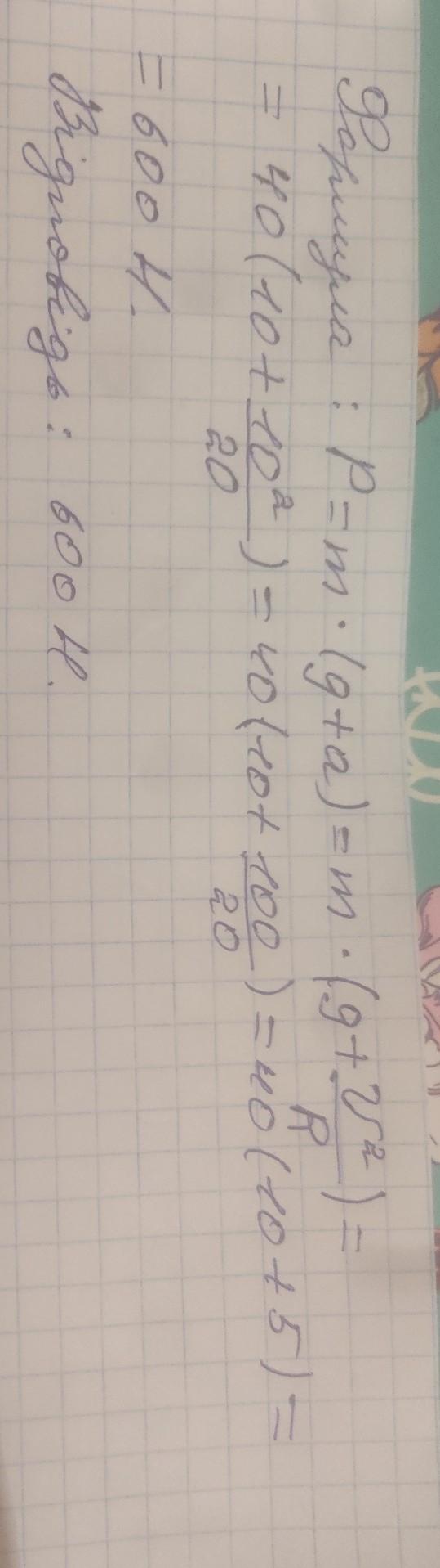 Хлопчик, масою 40 кг рухаючись на санчатах з швидкістю 10м/с проїжджає западину радіус якої 20м. Яка вага хлопчика в нижній точці западини?