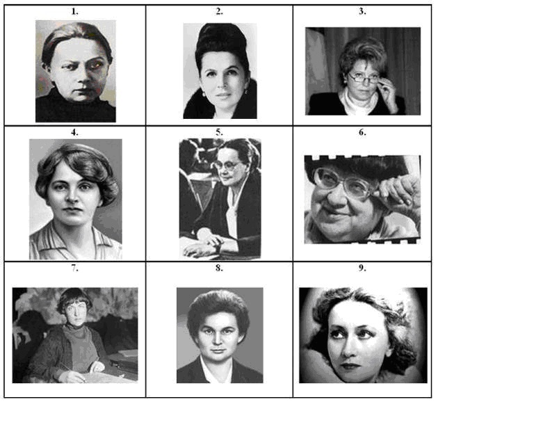 1.Надежда Константиновна Крупская 2.Галина Павловна Вишневская 3.Маргарет Тэтчер 4.Инесса Арманд 5.Зоя Васильевна Миронова 6.Валерия Новодворская 7.Александра Михайловна Коллонтай 8.Валентина Терешкова 9.Галина Уланова