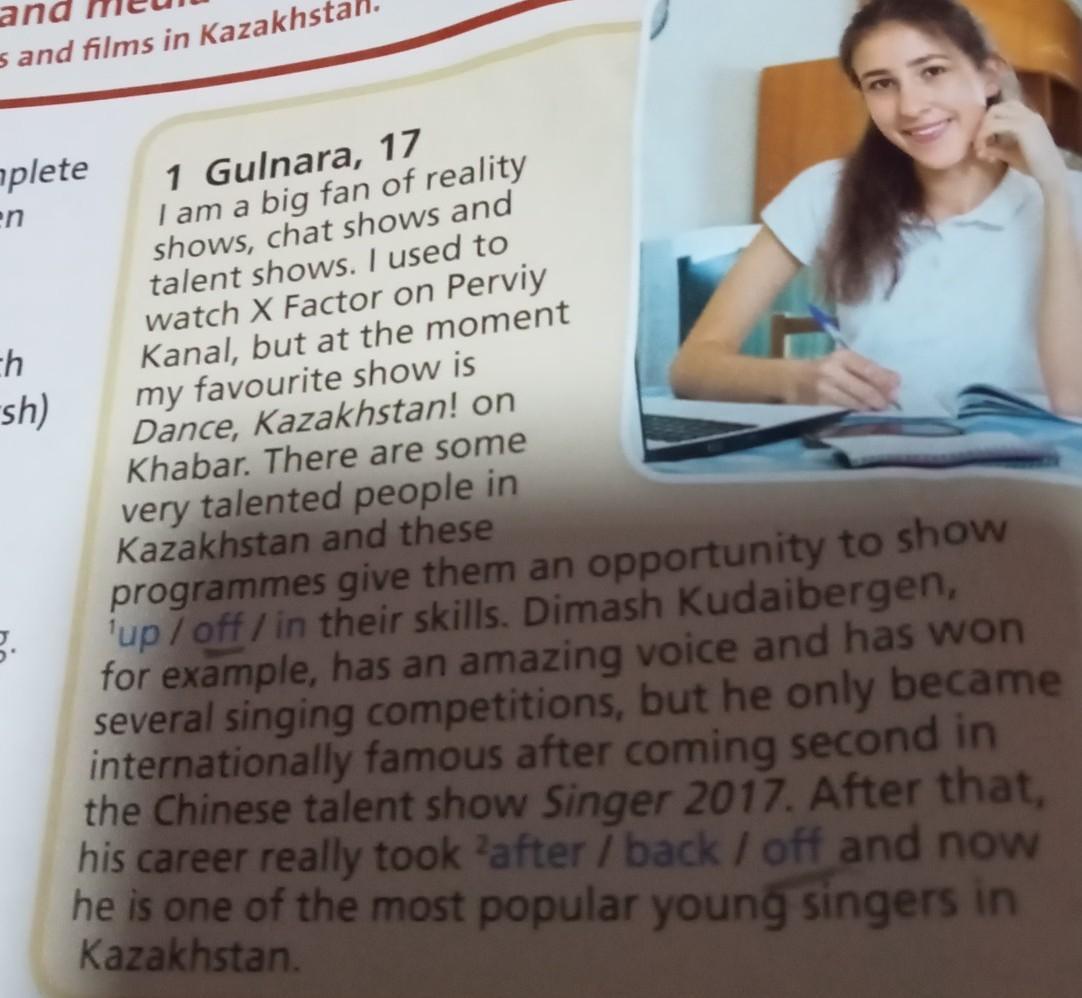 Ай эм а биг фан оф реалити шоус. Ай юзд ту фач х фактор он первый канал,бат ат зэ момент му фейворит шо ис дэнс, Казахстан он хабар. Зе ар сом вери талантд пипл ин кз энд зис программс гив зем эн аппортунити ту шоу оф зер скилс. Димаш к фор экзампл хас эн эмэйзинг войс энд хас вон северал сининг компетейшинс бат хи онли бикейм интернейшели фамоус афтер коминг секонд ин зе чайнас талент шоу сингер твенти сейвентин . Афтер зат хис карер рили тук оф анд нау хи ис уан оф зе маст популар янг сингерс ин кз