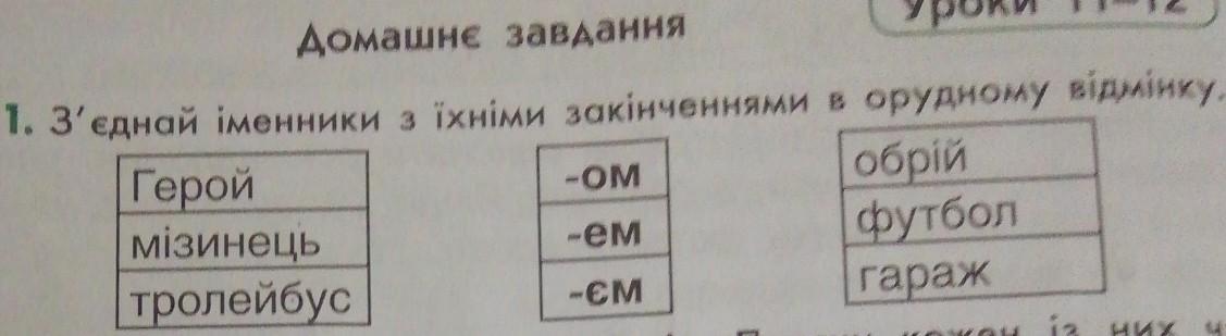 1. З'єднай iменники з їхніми закінченнями в орудному відмінку. обрій футбол гараж Герой мізинець тролейбус -OM -ем -CM