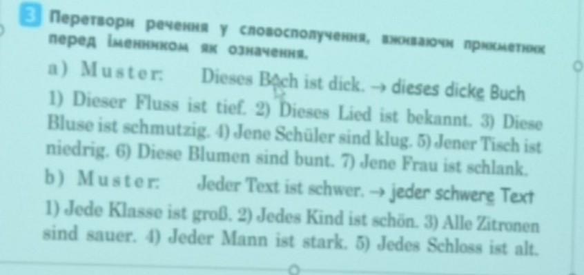 3 Перетвори речення у словосполучення, вживаючи прикметник перед іменником як означення. a) Muster: Dieses Boch ist dick. → dieses dicke Buch 1) Dieser Fluss ist tief. 2) Dieses Lied ist bekannt. 3) Diese Bluse ist schmutzig. 4) Jene Schüler sind klug. 5) Jener Tisch ist niedrig. 6) Diese Blumen sind bunt. 7) Jene Frau ist schlank. b) Muster: Jeder Text ist schwer. → jeder schwere Text 1) Jede Klasse ist groß. 2) Jedes Kind ist schön. 3) Alle Zitronen sind sauer. 4) Jeder Mann ist stark. 5) Jedes Schloss ist alt.