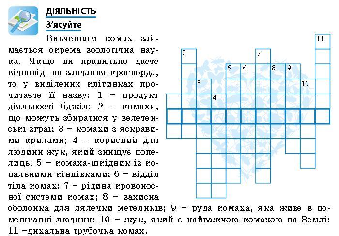 1 – продукт діяльності бджіл; 2 – комахи, що можуть збиратися у велетен- ські зграї; 3 – комахи з яскрави- ми крилами; 4 – корисний для людини жук, який знищує попе- лиць; 5 – комаха-шкідник із ко- пальними кінцівками; 6 – відділ тіла комах; 7 – рідина кровонос- ної системи комах; 8 – захисна оболонка для лялечки метеликів; 9 – руда комаха, яка живе в по- мешканні людини; 10 – жук, який є найважчою комахою на Землі; 11 –дихальна трубочка комах.