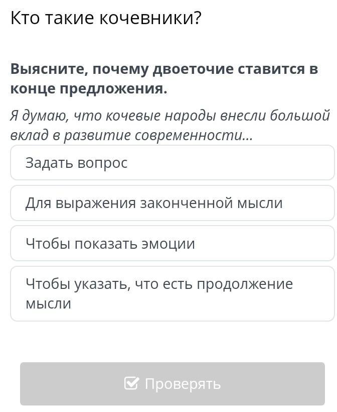 Выясните, почему двоеточие ставится в конце предложения. Я думаю, что кочевые народы внесли большой вклад в развитие современности... Задать вопрос Для выражения законченной мысли Чтобы показать эмоции Чтобы указать, что есть продолжение МЫСЛИ
