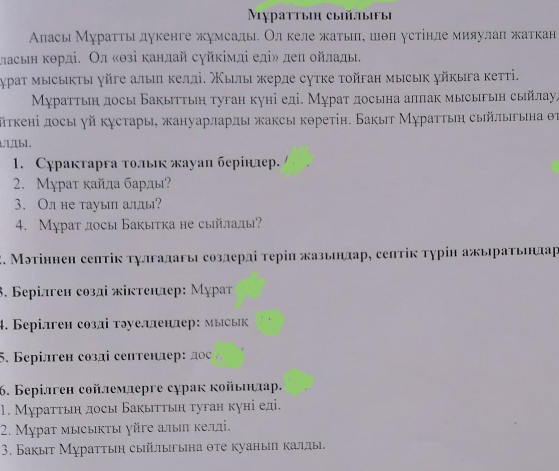3) Мұрат досы бақытқа өзі тауып алған мысығын сыйлады.