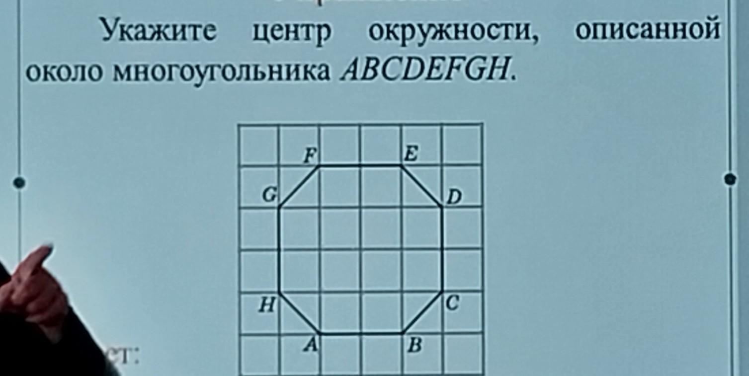 Укажите центр окружности, описанной около многоугольника ABCDEFGH. твет: G F A E B D (С