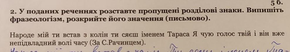 2. У поданих реченнях розставте пропущені розділові знаки. Випишіть фразеологізм, розкрийте його значення (письмово). Народе мій ти встав з колін ти сяєш іменем Тараса Я чую голос твій і він вже непідвладний волі часу (За С.Рачинцем).