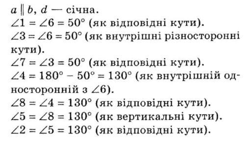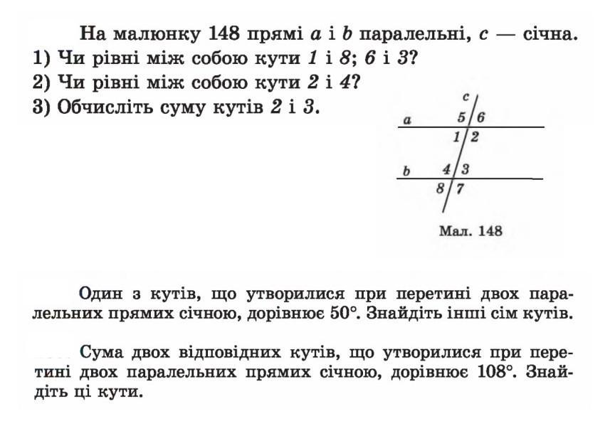 5. Сума двох відповідних кутів, що утворилися при перетині двох паралельних прямих січною, дорівнює 108°. Знайдіть ці кути. Утворені при перетині паралельних прямих січною відповідні кути рівні, отже, кожний з них дорівнює 108° : 2 = 54°. Відповідь: 54°.