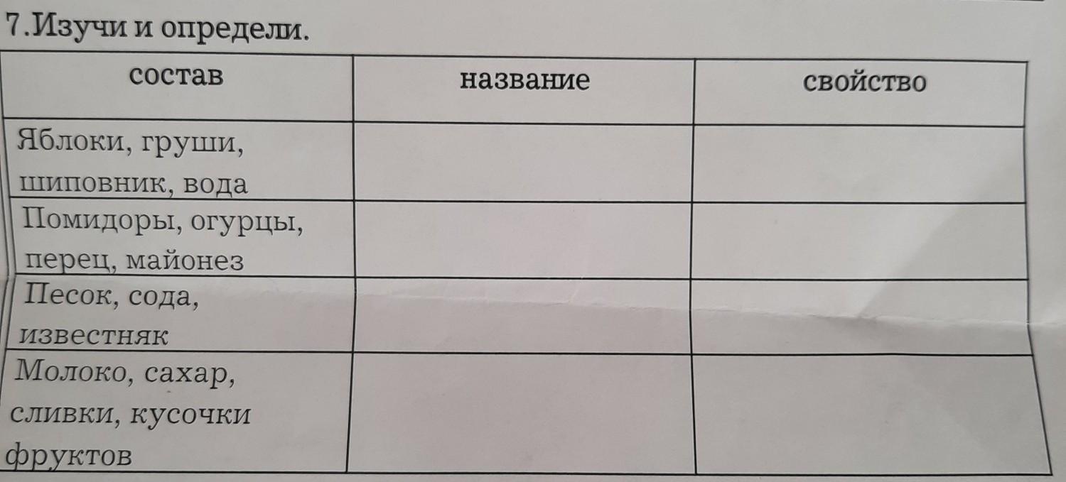 7.Изучи и определи. состав Яблоки, груши, шиповник, вода Помидоры, огурцы, перец, майонез Песок, сода, известнЯК Молоко, сахар, сливки, кусочки фруктов название свойство / ПОМОГИТЕ СРОЧНО ДАЮ 30 Б