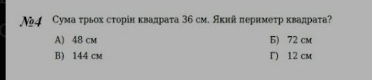 даю 60балов !!! №4 Сума трьох сторін квадрата 36 см. Який периметр квадрата? A) 48 см B) 144 см Б) 72 см г) 12 см