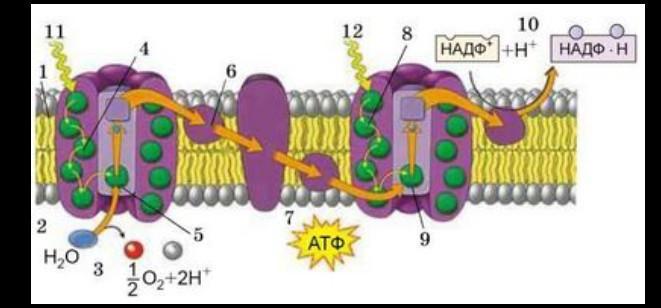 Ответ:1 - мембрана тилакоїда; 2 - внутрішній простір тилакоїда; 3 - завдяки фотолізу води звільняються електрони, які відновлюють фотосистсму II; 4 - фотосистсма II; 5 - реакційний центр фотосистсми II; 6 -ланцюг перенесення електронів; 7 - енергія, що звільнилася, частково використовується на синтез молекул АТФ; 8 - фотосистсма І; 9 - реакційний центр фотосистсми І; 10 — відновлення НАДФ; 11 - квант світла, що потрапляє на фотосистсму II; 12 - квант світла, що потрапляє на фотосистсму І