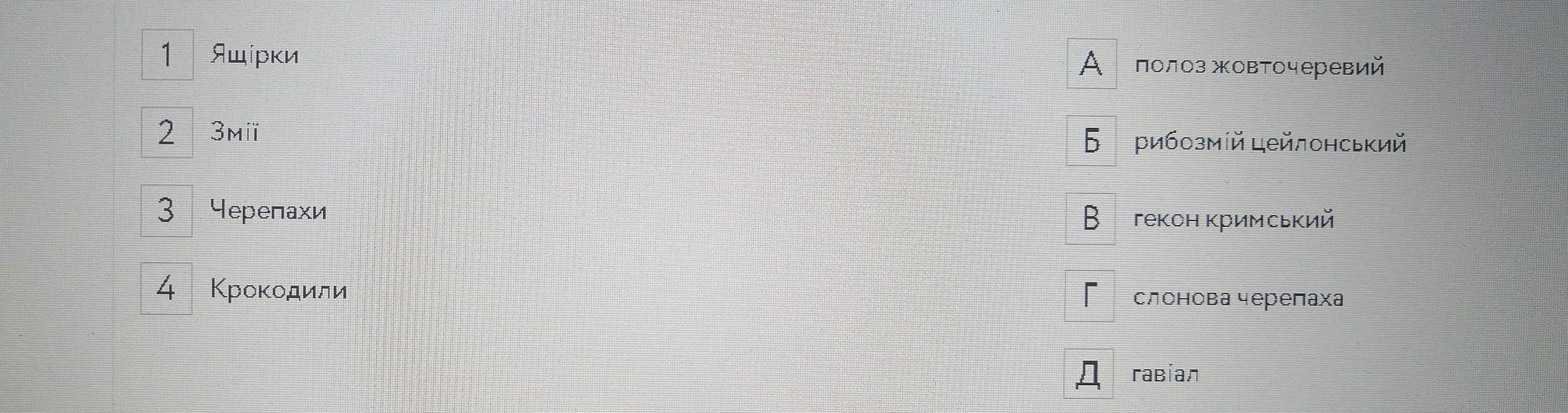 Установіть відповідність між групою рептилій (1-4) та її представником (А-Д). ДУЖЕ СРОЧНО