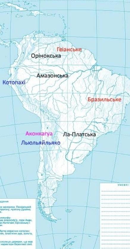 ПРАКТИЧНА РОБОТА № 5 (продовження) Позначення на контурній карті назв географічних об'єктів Південної Америки Позначте на контурній карті такі основні форми рельєфу, низовини: Амазонська, Орінокська, Ла-Платська; плоско- гір'я: Бразильське, Гвіанське; гори Анди, г. Аконкагуа; вулкани: Льюльяйльяко, Котопахі.
