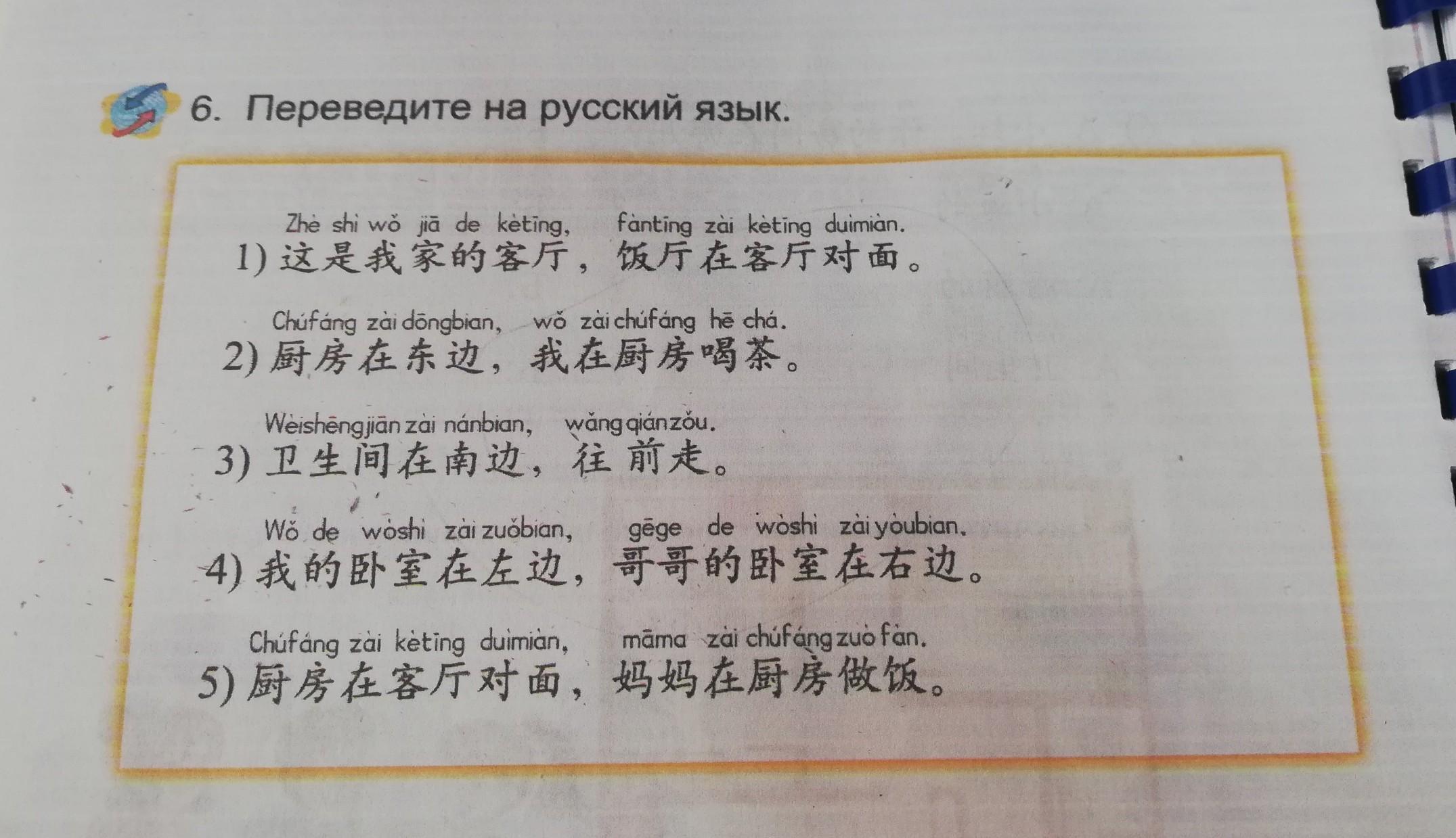 Zhe shi wo jia de keting, fanting zai keting duimian 1) Это гостиная моего дома, а столовая находится напротив гостиной.