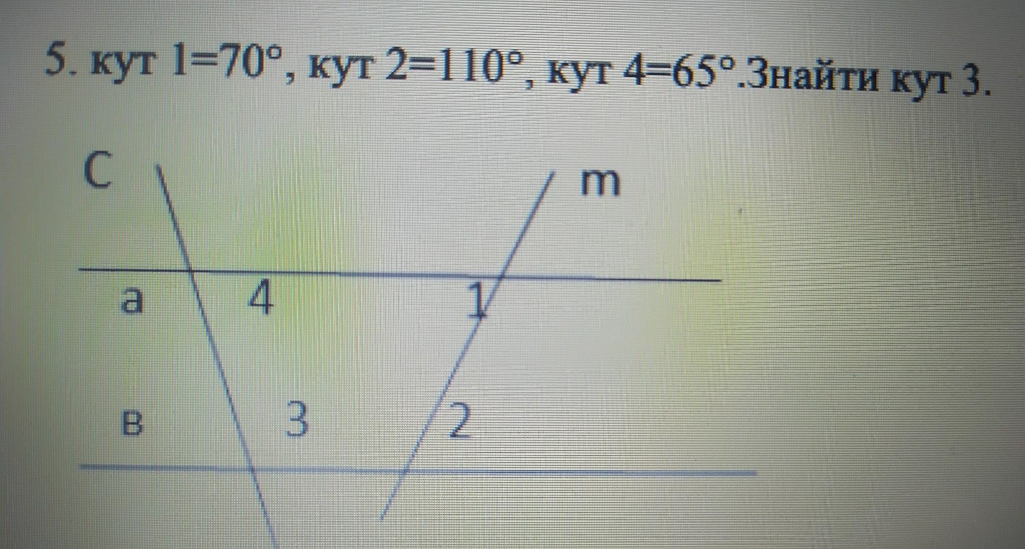 кут 1=70° , кут 2=110° , кут 4=65° . Знайти кут 3.