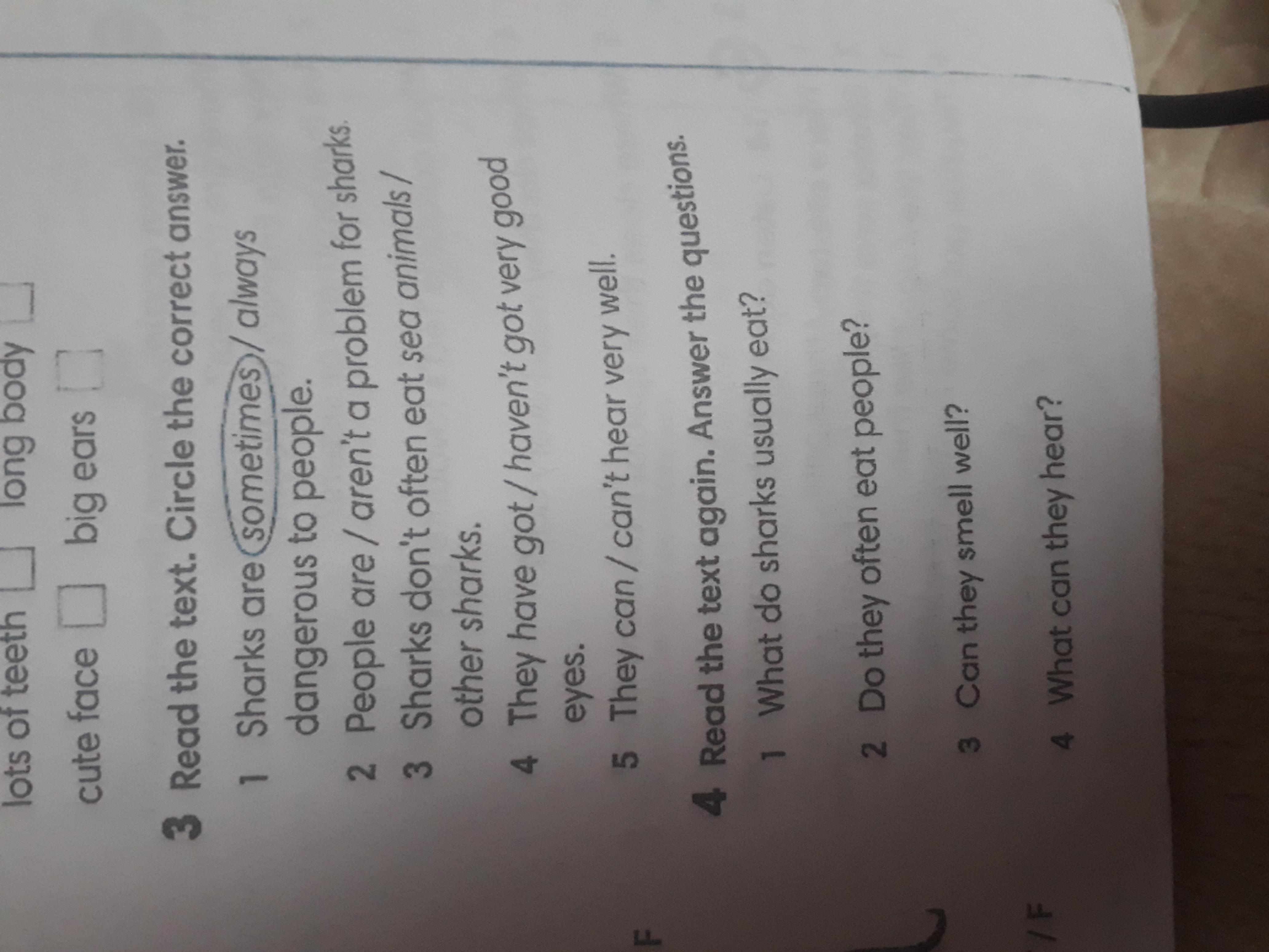 Помогите пжжжжжжж вот текст к вправе What do sharks usually eat They eat fish and other sea animals They sometimes eat other sharks Are the clever? What can they do Sharks are strong and they can swim fast They can see and smell under water very well Can they hear Good guestions It's amazing They haven't got ears like our ears but they can hear fish from hundreds of kilometres away