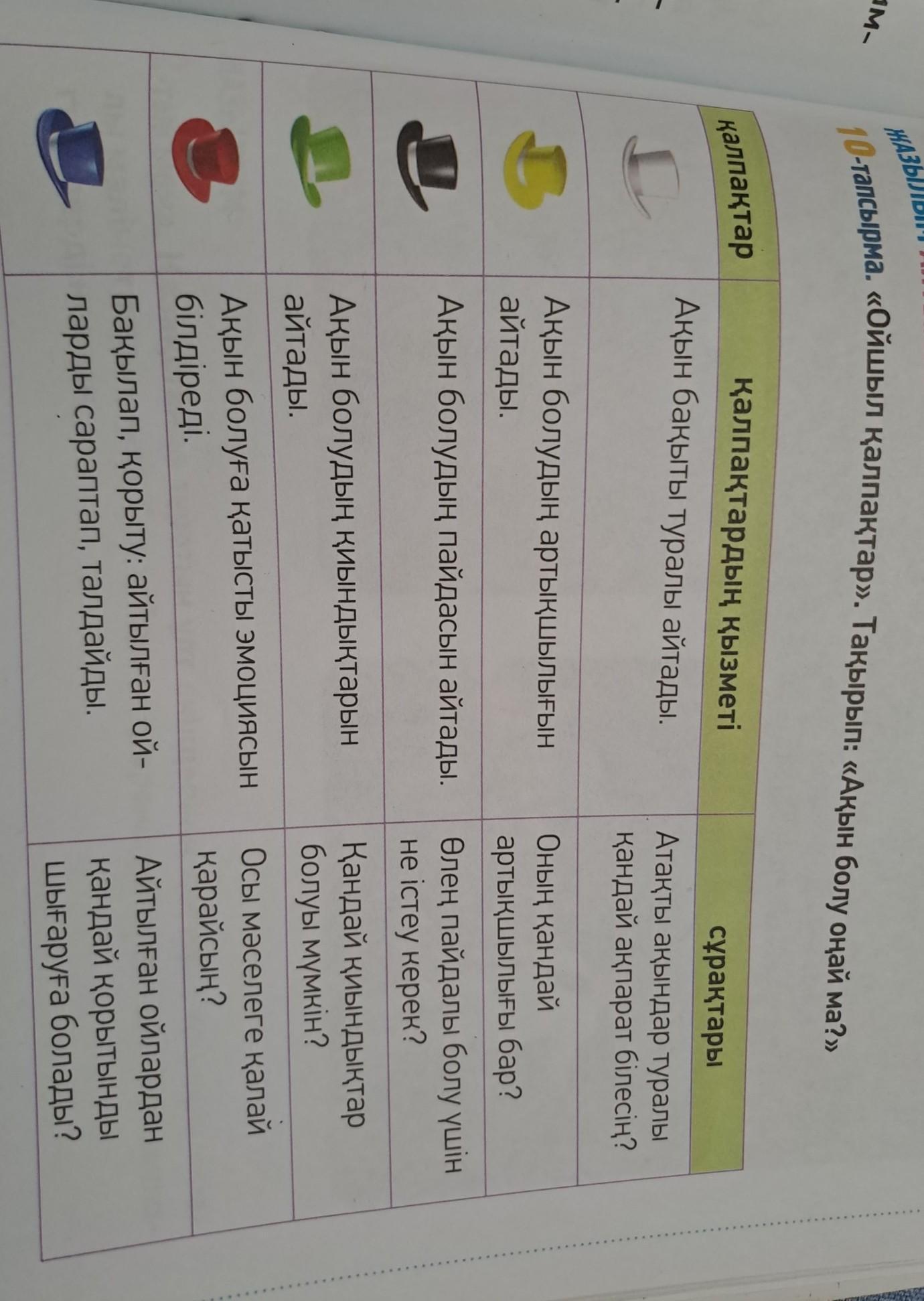 10-тапсырма. «Ойшыл қалпақтар». Тақырып: «Ақын болу оңай ма?» калпақтар қалпақтардың қызметі Ақын бақыты туралы айтады. Ақын болудың артықшылығын айтады. Ақын болудың пайдасын айтады. Ақын болудың қиындықтарын айтады. Ақын болуға қатысты эмоциясын білдіреді. Бақылап, қорыту: айтылған ой- ларды сараптап, талдайды. сұрақтары Атақты ақындар туралы қандай ақпарат білесің? Оның кандай артықшылығы бар? Өлең пайдалы болу үшін не істеу керек? Қандай қиындықтар болуы мумкін? Осы мәселеге қалай карайсың? Айтылған ойлардан қандай қорытыНДЫ шығаруға болады?