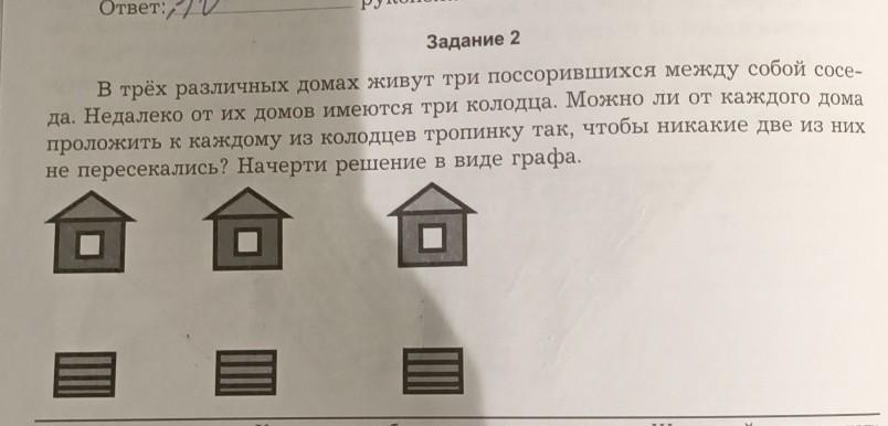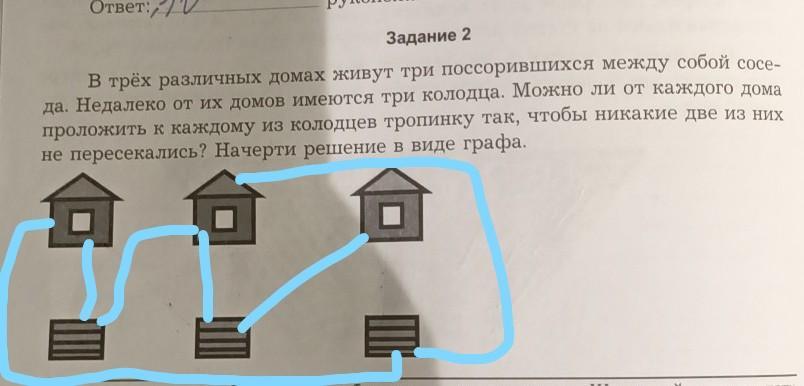 Задание 2 В трёх различных домах живут три поссорившихся между собой сосе- да. Недалеко от их домов имеются три колодца. Можно ли от каждого дома проложить к каждому из колодцев тропинку так, чтобы никакие две из них не пересекались? Начерти решение в виде графа.