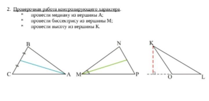 провести медиану из вершины А; провести биссектрису из вершины М: провести высоту из вершины К. А L