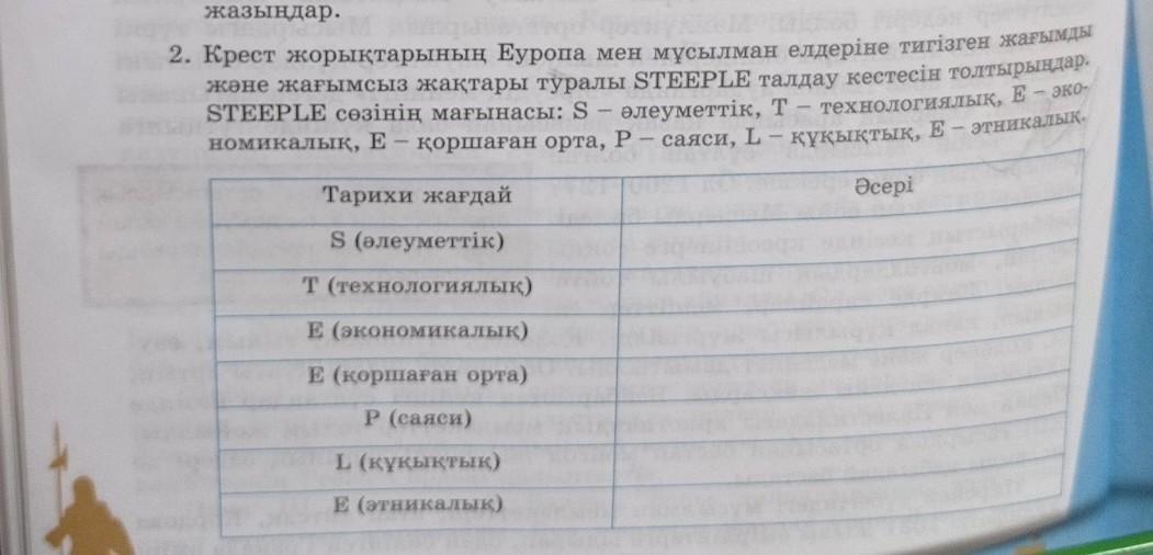 2. Крест жорықтарының Еуропа мен мұсылман елдеріне тигізген жағымды және жағымсыз жақтары туралы STEEPLE талдау кестесін толтырындар. STEEPLE сөзінің мағынасы: S әлеуметтік, т технологиялык, Е - эко- номикалык, Е қоршаған орта, Р - саяси, L құқықтық, Е этникалык. Әсері 1 Тарихи жагдай S (әлеуметтік) Т (технологиялық) E (экономикалық) E (қоршаған орта) Р (саяси) L (құқықтық) E (этникалық) 60